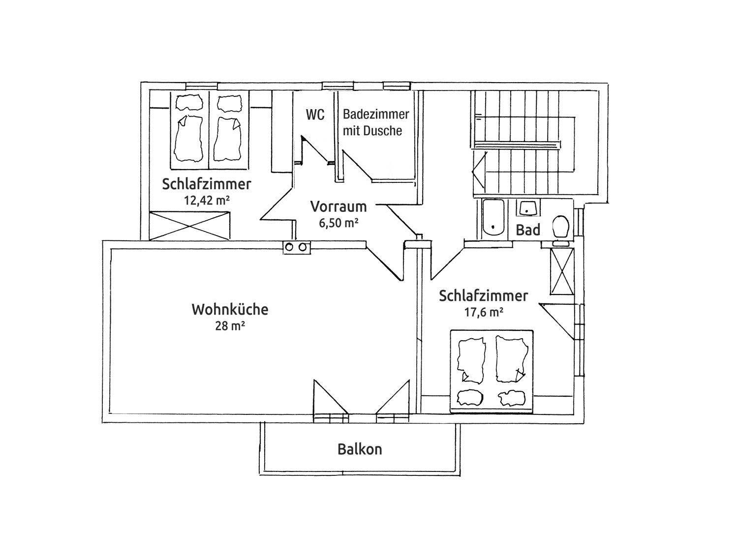Die Ferienwohnung befindet sich im zweiten Obergeschoß und bietet Platz für bis zu 5 Personen.